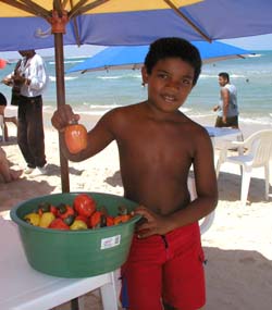 After our morning walk and a breakfast on the beach, we climbed the road through the tiny port up to the center of the village. Fruit stands, restaurants and tourist shops line the streets. By night, Praia do Centro becomes a crowded scene, a bazaar mixture of street side cafes and street vendors, reminiscent of the 60s hippie scene in the U.S.